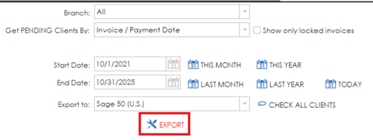 Once you have your cases selected to be ready for export, the "export to" drop down can be used to select your accounting software. Export options are available for the following: