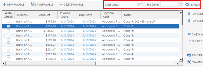 Any payables that have been entered into the system will show in the payable transactions list at the bottom of the tab. Payable transactions can be searched using the start/end date boxes at the top of the list. Click the refresh button to refresh with the date range you enter.