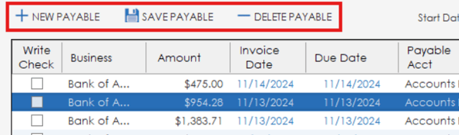 Options are also available above the list of payables to add a new payable, save changes to a payable or delete a payable.