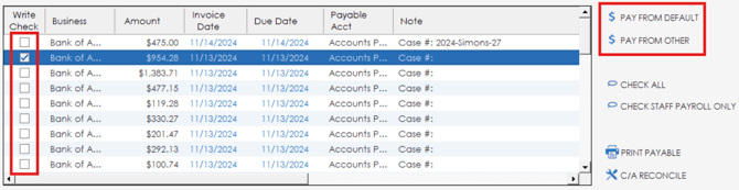 Checks can be generated for payables directly from the accounts payables list. Simply check the "Write Check" toggle beside any entries you want to generate checks for, then click the "Pay From Default" or "Pay From Other" options on the right side. This will create a check in the system for that payable that can be viewed under the checks tab of the accounting page.