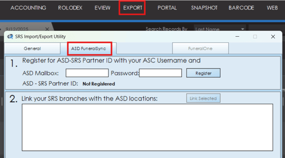The ASD integration allows for case and service details to be sent directly to ASD through SRS. On the export page, a tab called ASD FuneralSync is available where the integration can be set up.