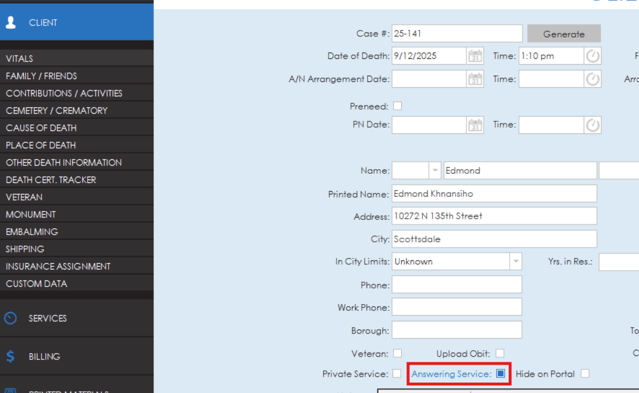 For information to send to ASD, a date of death is required on the case and a service with a future date. If a case has these two things and the Answering Service box is selected, updates of the client information and service information will be sent to ASD every 15-20 minutes.