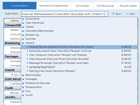 Items from the general price list can be added to the invoice by selecting an item from the "Add Item" drop down list.