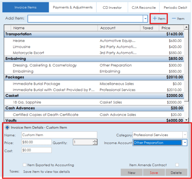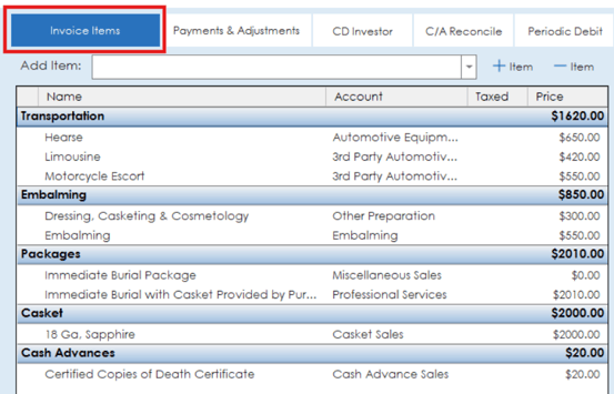 On the Invoice Items section, the various categories and items on an invoice will be listed out with prices.