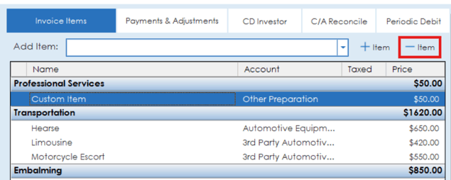 To delete an item from the invoice, highlight the item and click the item button with a minus beside it.
