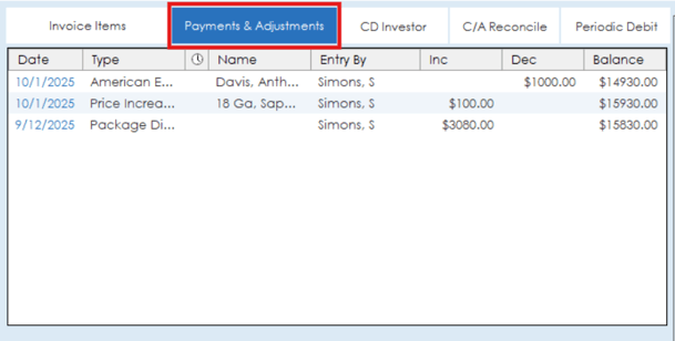 The payments and adjustments section will show any payments, discounts or adjustments that have been added to an invoice. Any payments, discounts or adjustments will be listed out showing the date, type, name of purchaser or item and amounts.