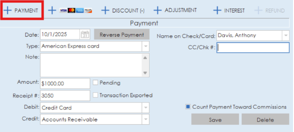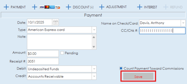 Date of payment, type of payment, amount, receipt number, name on check/card, CC/Check number and debit/credit categories can all be entered for the payment. Once you have all the payment information entered, click the save button to add the payment to the invoice.