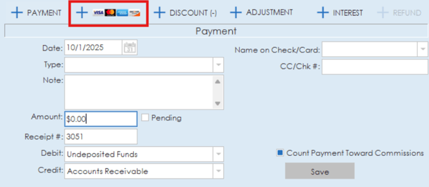 If a merchant account is connected to the system, payment processing functionality is possible through the payment icon that displays credit card options. The information entered in this section is the same as the other payment entry option but the payment can actually be processed through your connected merchant account in this case.