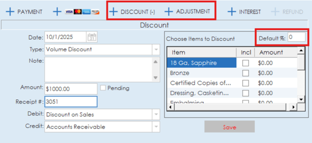 Both the discount and adjustment options will require items to be selected from the item list on the right to apply the adjustment or discount to. Information for date, type, amount and debit/credit categories can be added on these entries. If you would like to discount or adjust items by a percentage, you can utilize the default % option above the item list to enter that.