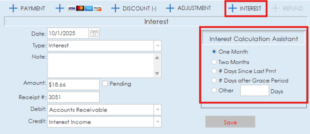 The interest option allows you to add interest entries to the invoice. The interest calculation assistant on the right side offers a few different options for calculating the interest amount based on number of months or days. Like the other sections, information regarding date, type, amount, receipt number and debit/credit type can all be added to the interest entry.