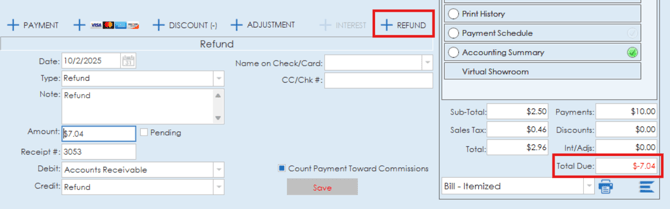 If a balance for an invoice is negative, the refund option will be available. The refund option allows you to add a refund amount to the invoice. Date, type, amount, receipt number and debit/credit details can all be added to the refund entry. If the total on the invoice needs to be altered but the invoice balance is not in negative, the adjustment option should be used instead of the refund option.