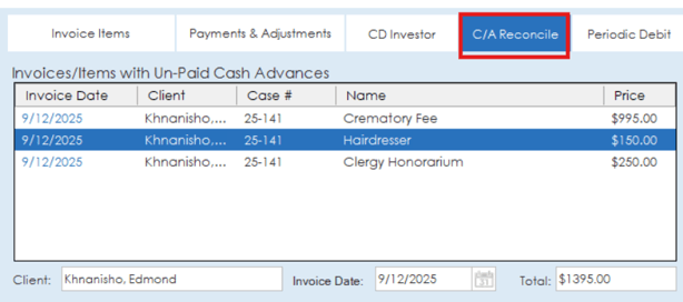The cash advance reconcile section will display any paid or unpaid cash advances from the invoice. The section at the top of the page will display any unpaid cash advances that are on the invoice.