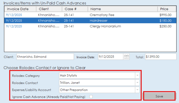 To add a cash advance to the paid list, simply highlight the item in the list, select the appropriate category, contact and expense type, then click the save button. A checkbox option is also available to ignore the cash advance and remove it from this section if it is already paid or not something that needs to be paid.
