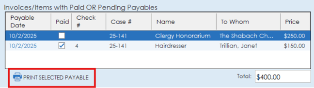 Once a cash advance has been added to the paid or pending payables list, a check can be printed to pay the vendor by clicking the "Print Selected Payable" button.