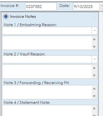 Under the notes section, reasons can be added for embalming ,vault, forwarding/receiving funeral home or general statement notes can be added.