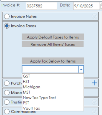 The invoice taxes section gives you the option to apply default taxes to all items, or remove tax from all items. Specific types of taxes can also be applied to all items using the drop down list to select a certain kind of tax.
