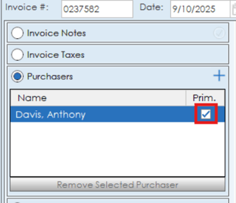 The purchasers option allows you to manage purchasers for the invoice. Purchasers will populate in this area if the person is marked as a purchaser in the family and friends tab of the case. Primary purchaser can be marked via the primary checkbox. Purchasers can also be added from the rolodex via the plus icon.