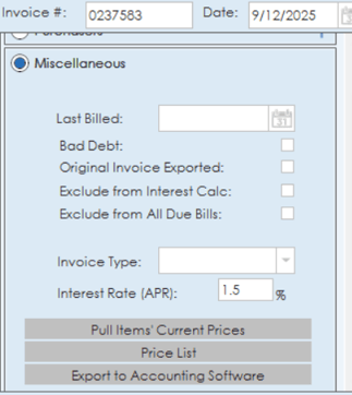 Under the miscellaneous section, a variety of options are available. A last billed date can be set, or the invoice can be marked to be excluded from the All Due Bills report. The invoice can be marked as bad debt or can also be toggled to be excluded from interest calculations, the interest rate can also be set to a certain percentage.