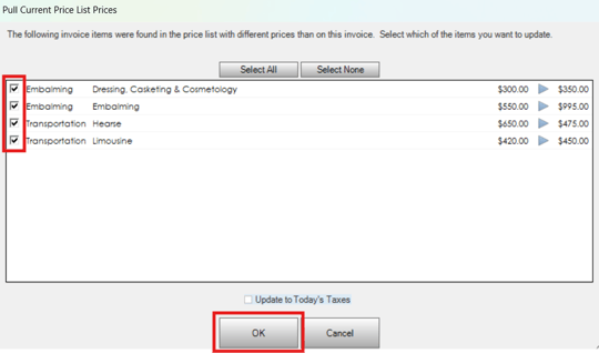 The "Pull Items Current Prices" option will update the price of all items to the current prices in the GPL. Once you click this option, a window will appear that shows what items will have prices changed and you will be shown the old price and the new current price. Simply check what items you want to update prices for and hit ok to save the changes.