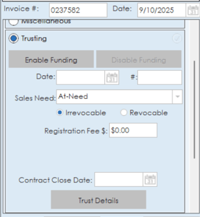 The trusting sections allows to enable or disable trust funding on the invoice. Date and sales need information can be set along with a registration fee amount. The trust details button will take you to the trust page where trust contracts can be set up and edited. More information on the trust billing feature is available in the trusts article.