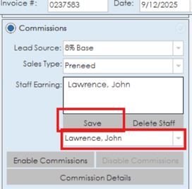 The commissions section is where staff members can be added who will earn commission on this particular invoice. A lead source and sales type can be added along with the staff member. Select a staff member from the drop down list and click save to add them as a commission earner.
