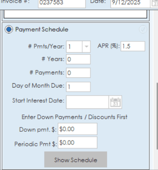 In the payment schedule section, details can be added regarding yearly payments and amounts. Details like payments per year, APR percentage, number of years of payments, due dates and down payment amounts can all be added.