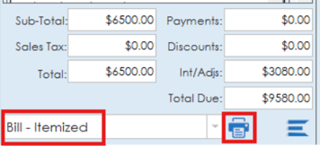 At the bottom of the invoice option tabs, totals and subtotals are displayed. Totals are not editable in this area and would need to be edited via the item pricing or discounts and adjustments. A list of printable documents are available for the invoice via the drop down list. Select an invoice document and click the print icon to print.