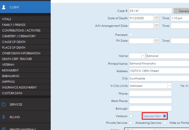 Once the CFS integration is set up in your system, cases can easily be published to the website by clicking the Upload Obit checkbox on the client tab.