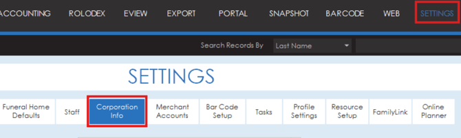 The corporation info settings will allow for corporation level settings and information to be configured in the system.