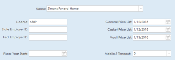 The corporation can be selected from the name drop down list, and information such as license, state employer ID, federal employer ID, start of finance year and price list dates can all be added.