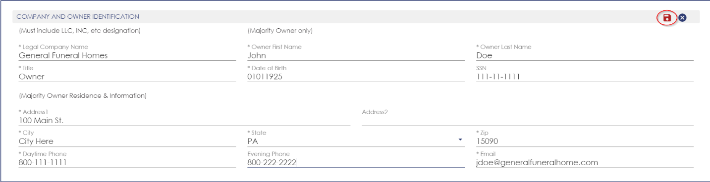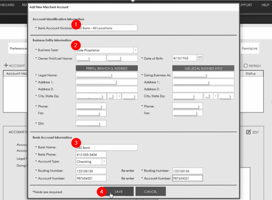 Enter the company’s information using the personal information for the individual attached to the company bank accounts. Click Save to continue. All information is confidential and is used for Vantage to confirm your business entity with the IRS.