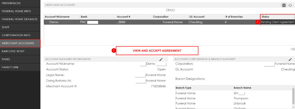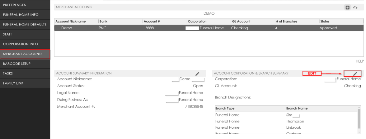Finally, assign the E-Pay merchant accounts to a corporation. Select the account in the top box, then click on the Edit button in the Account Corporation & Branch Summary section.