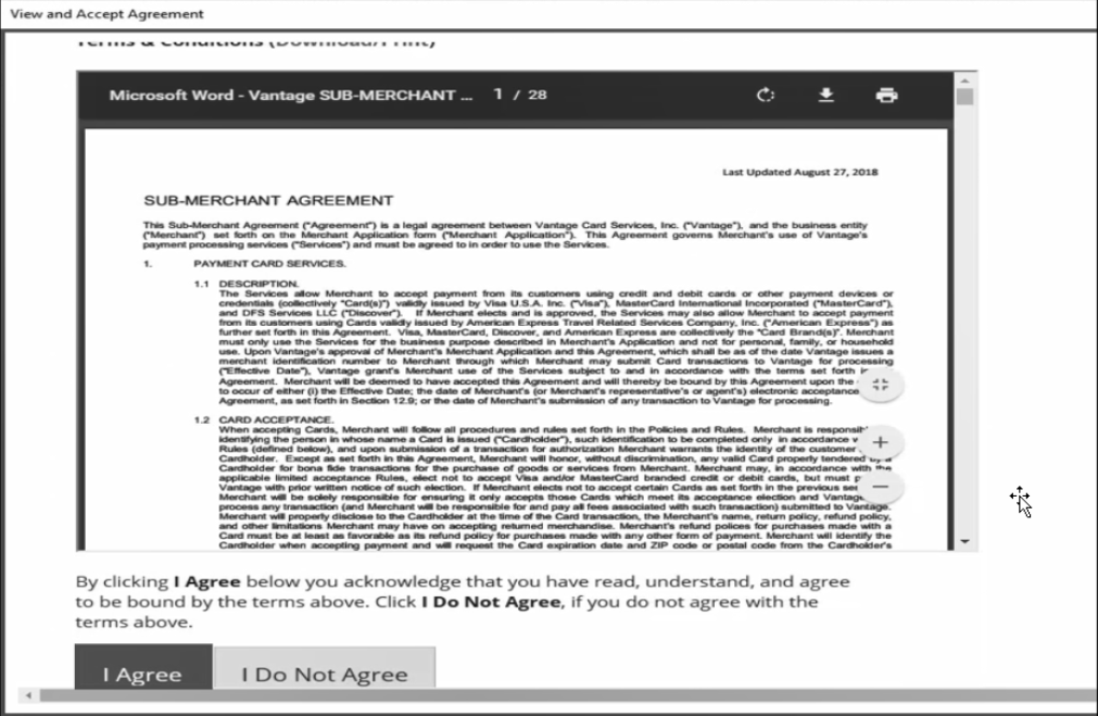 Accept and agree to Vantage’s Merchant Service Agreement. Approval may take 24-36 hours.