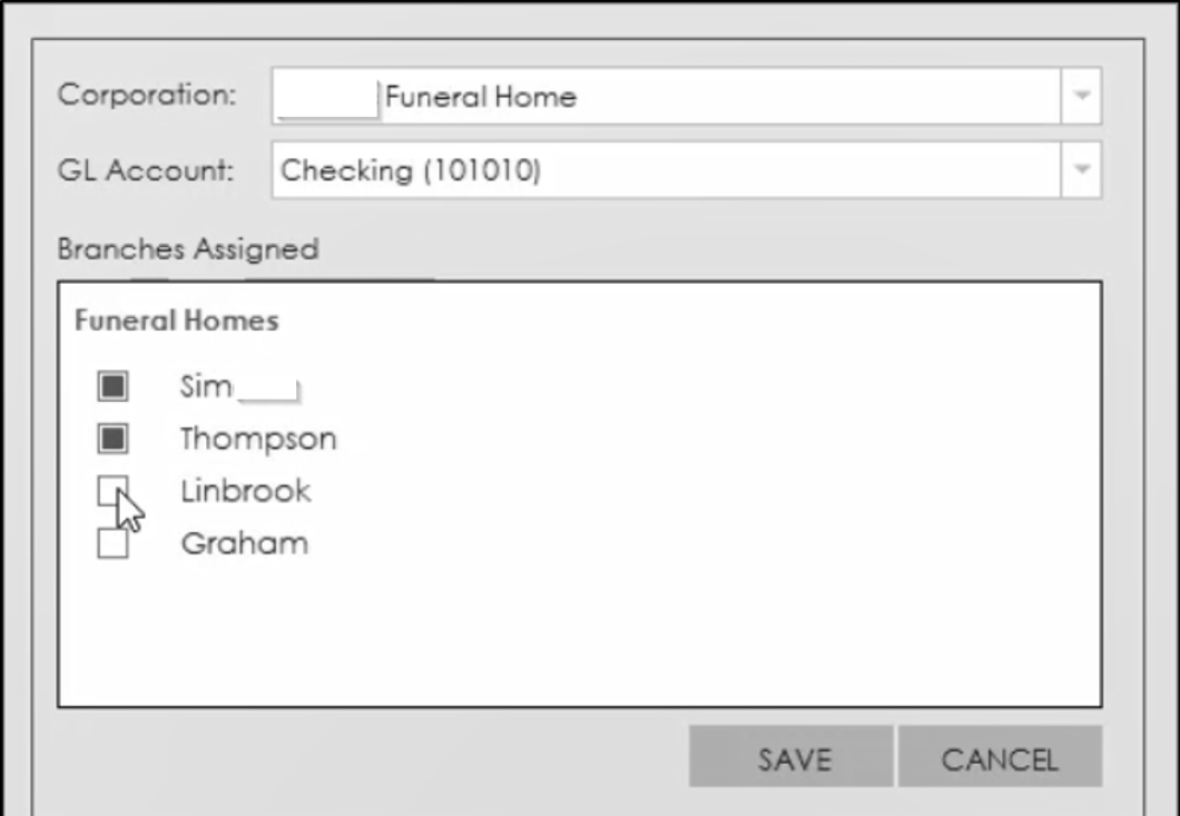 Choose the corporation that will use the selected E-Pay merchant account, along with the Bank name GL account for those payments to go into. Check each branch that will be associated with the account. Click Save.