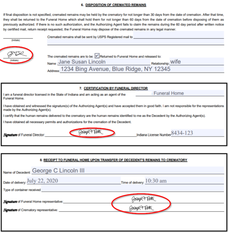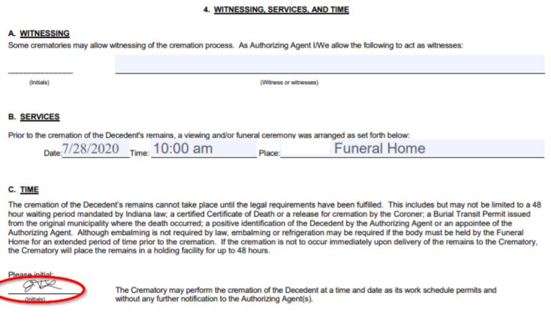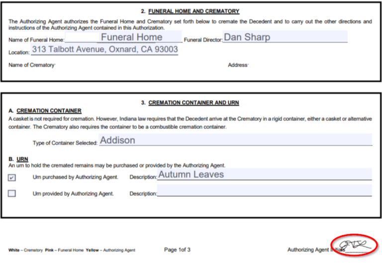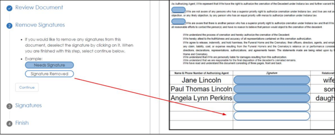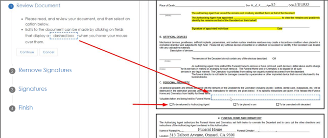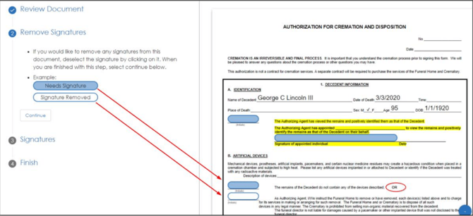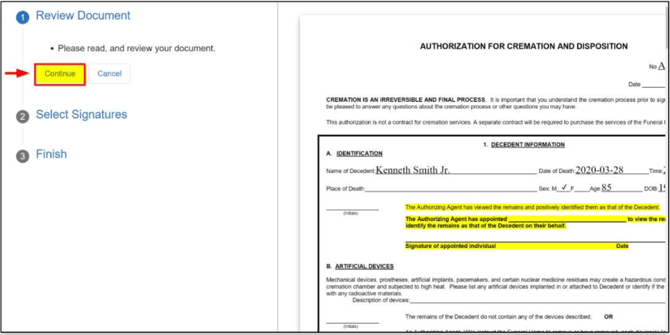 The next screen shows the document that needs signed. The funeral home can review it by scrolling through the form.