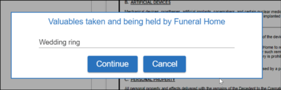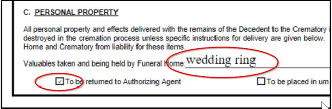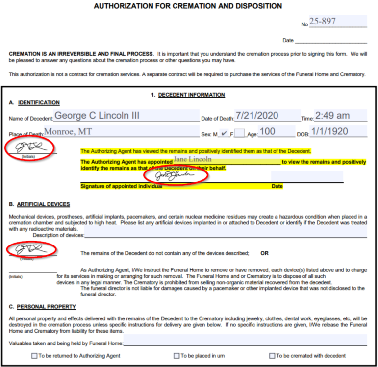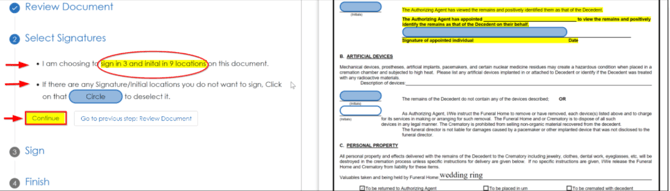 Example 2: On a Crematory Authorization where there are “or” statements. In other words, where they would only sign in either one field OR the other. You can see this in the Artificial Devices section as shown below.