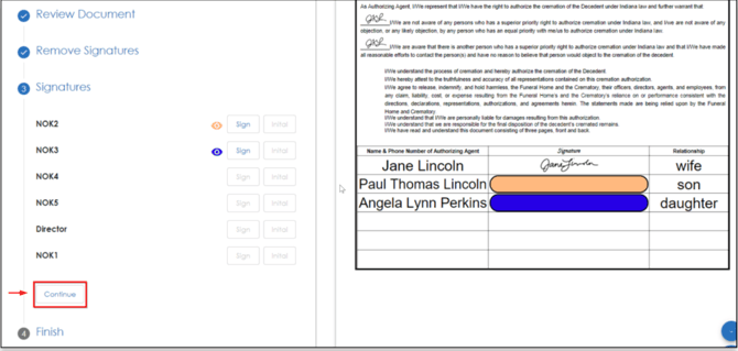 In this example, we have NOK1, NOK2, NOK3 and the Funeral Director. Colors are associated with each signer.