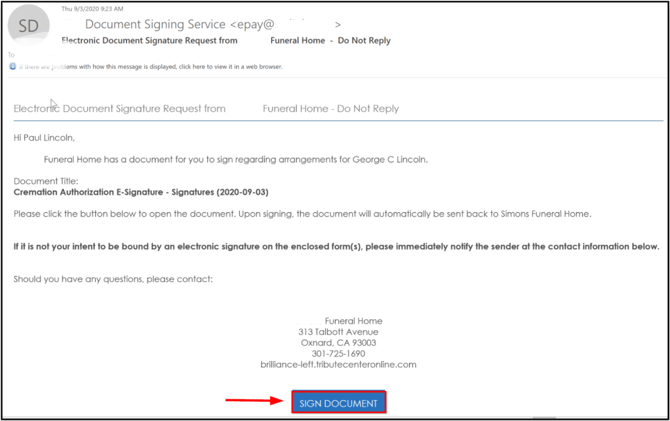 The family will receive an email with a link to sign the document. Below is the email the family receives.