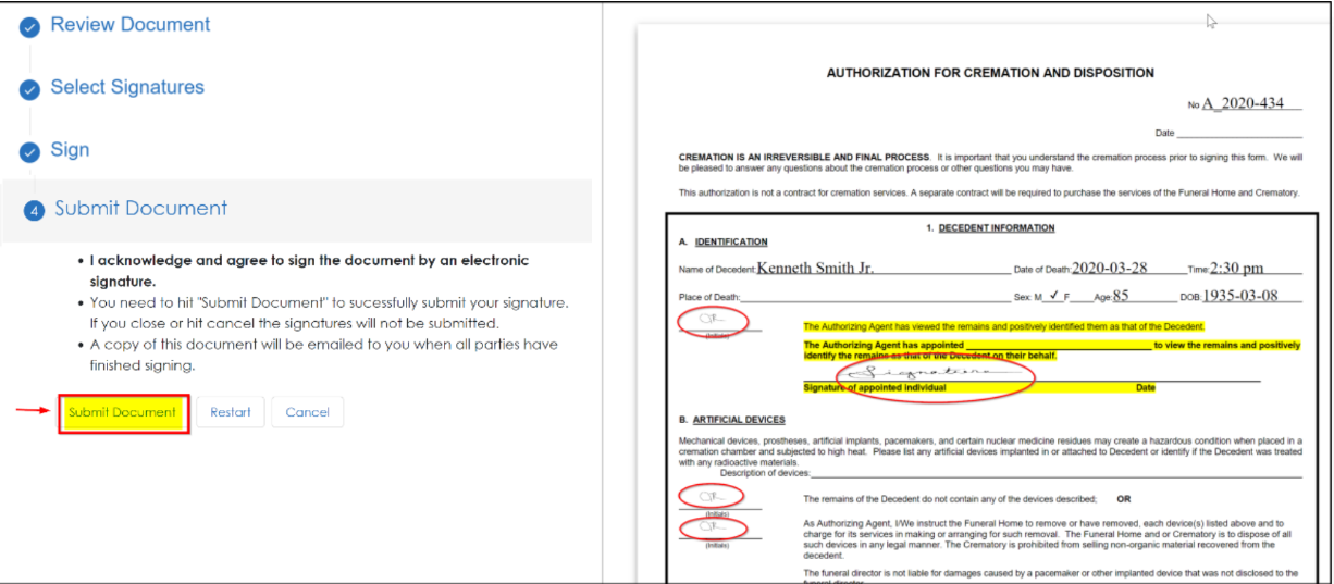 They can click Restart if changes are needed. Then click Submit Document to finish.