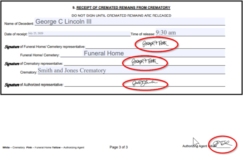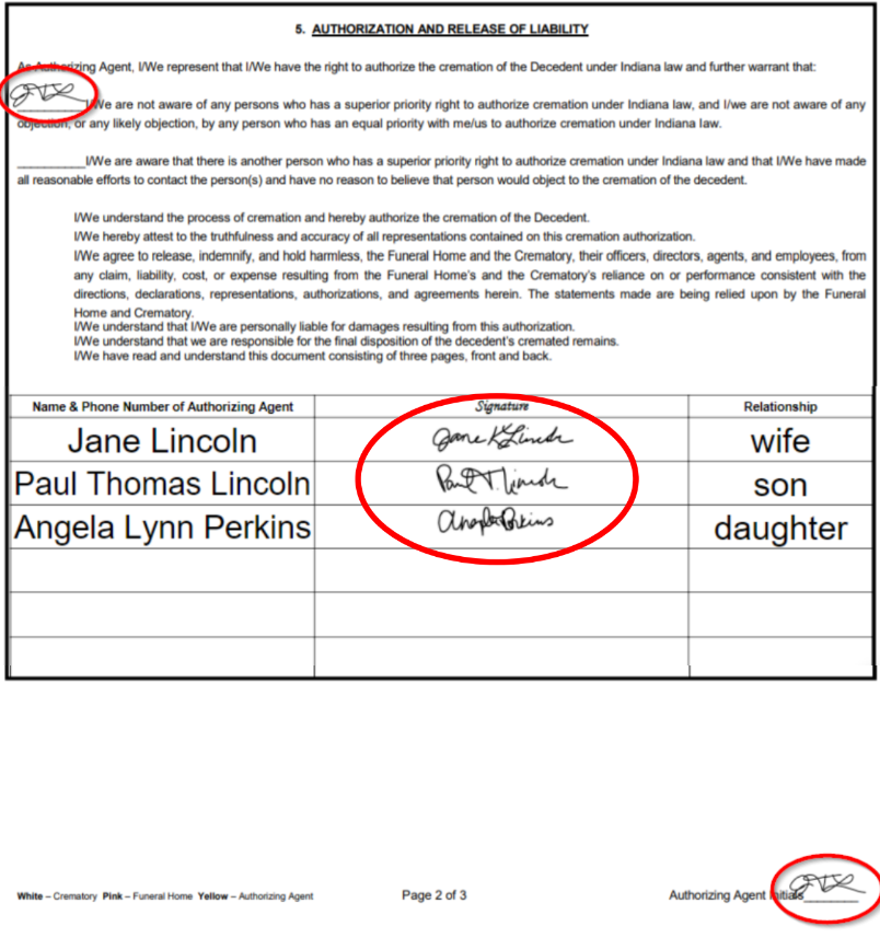 Family members or Funeral Directors who are still required to sign this document will be listed in the box. Those who have signed in person will not be listed.