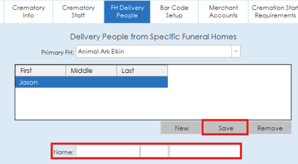 The FH Delivery People settings tab is a settings page that is specific to Phoenix. On this page people can be added to the list of delivery people for each funeral home by entering a name at the bottom of the page and clicking the save button.