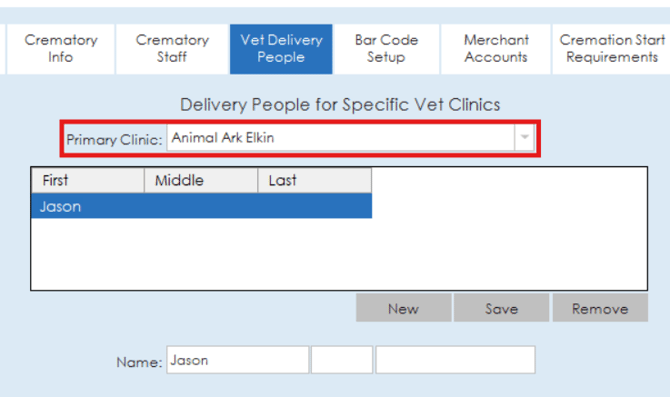 In Phoenix Pet, this section will be titled "Vet Delivery People". The functionality is the exact same as in Phoenix but the Primary FH drop down list will instead be Primary Clinic and display vet clinics.