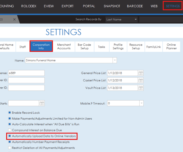 You can also choose to have your cases sync with your website automatically by navigating to the corporation info tab within settings and checking the box which says “Automatically Upload Data to Online Vendors”.