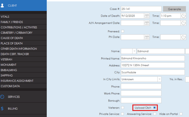 Setting this option will cause the Upload Obit check box on the main client screen to be automatically checked for each new case added.