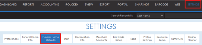 On the funeral home defaults page, a variety of default settings and information can be configured on a branch by branch basis. To access this section, navigate to the settings page and select the funeral home defaults tab.