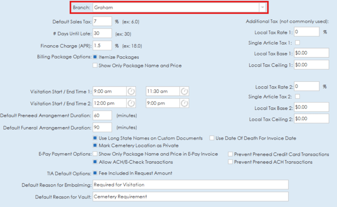 The funeral home defaults settings allow for default values and settings to be configured for branches.