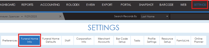 The Funeral Home Info tab allows for configuration of settings and information specific to funeral home branches in the system. To access these settings, navigate to the settings page and select the Funeral Home Info tab.