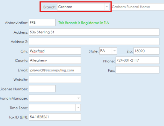 Various pieces of information regarding funeral home locations can be configured under this section. Address and contact information can all be configured here for each branch. The drop down list at the top of the section can be used to navigate between different branches when editing information.