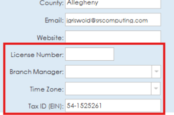 Other important information such as license number, branch manager, time zone and tax ID can all be configured in this section as well.