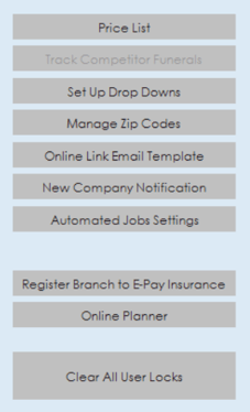 The funeral home info settings allow for customization of branch specific information and configuration of various system data for those branches such as price lists, online planner, drop downs, zip codes and more.